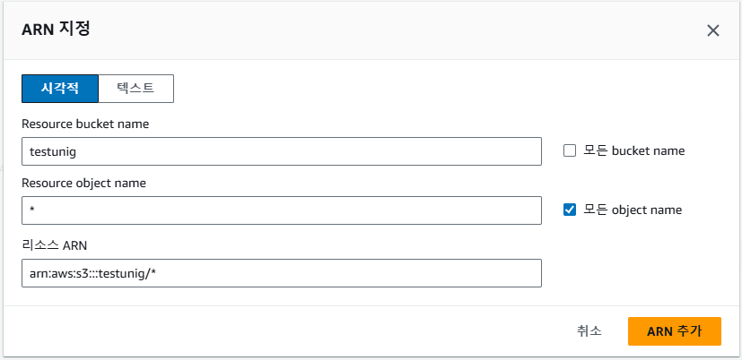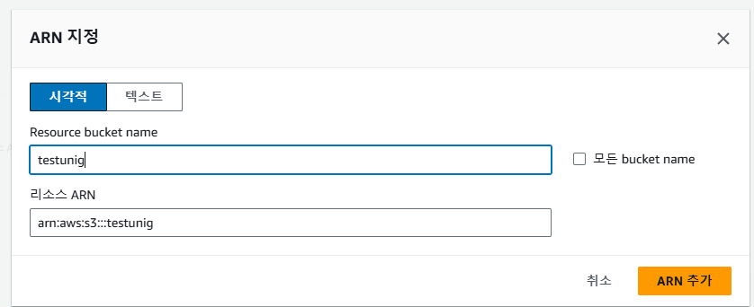 밑으로 내려가서 bucket의 ARN을 추가할 수 있다. ARN이란 특별한건 아니고 Amazon Resource Name의 준말이다. 즉, 그냥 선택된 리소스가 무엇이냐. 라는 뜻이다.