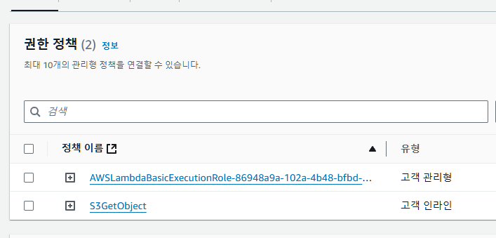 IAM 정책 권한을 설정하지 않으면 위의 함수 코드의 에러가 발생한다. 이유는 AWS S3에 대한 정책 권한이 없기 때문이다.