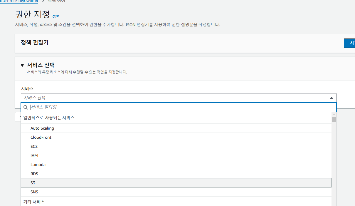 우리는 S3에서 JSON 데이터를 가지고 올 것이므로 서비스를 'S3'를 선택한다.