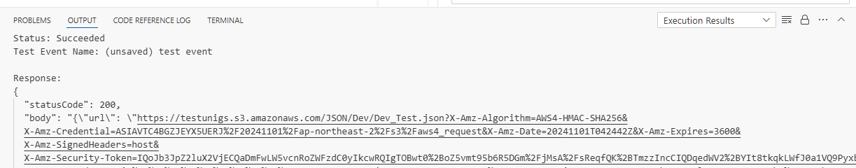 정상적으로 작동이 된다면, 아래와 같이 'OUTPUT' 콘솔 중 'statusCode' 가 200이 뜨고, 'body'에 URL 주소가 반환될 것이다.