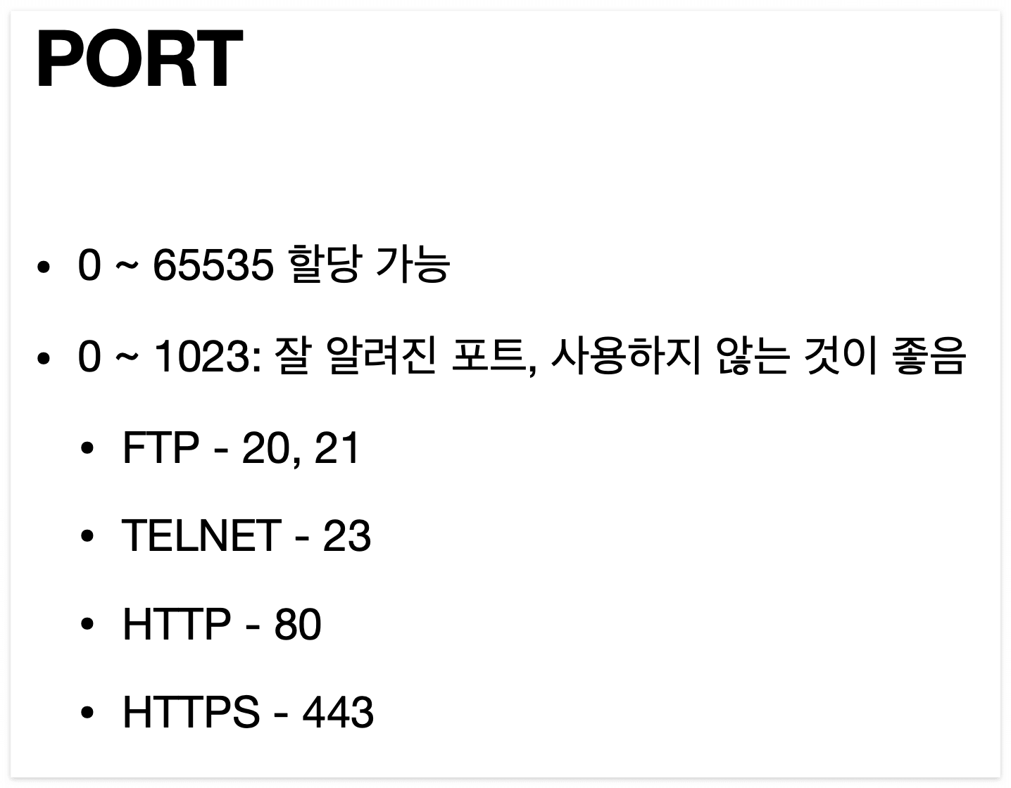기본적으로 0 ~ 65535 까지 PORT를 할당할 수 있는데, 기본적으로 미리 알려지고 지정된 PORT들이 있기 때문에 위와 같이 지정된 PORT는 사용하지 않는 것이 좋다.