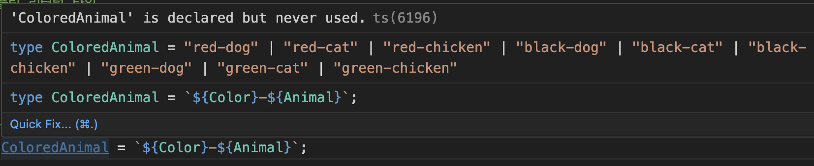템플릿 리터럴을 사용하여 타입을 지정하면 ColoredAnimal은 두 타입을 가진 모든 유니온타입을 나타낸다.