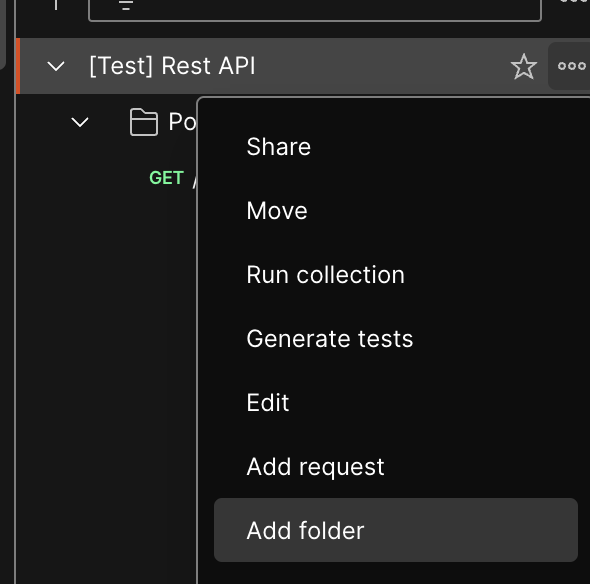 컬렉션 이름을 변경 후 오른쪽마우스 혹은 ··· 을 누른 후 'Add folder' 를 눌러 폴더를 생성한다.